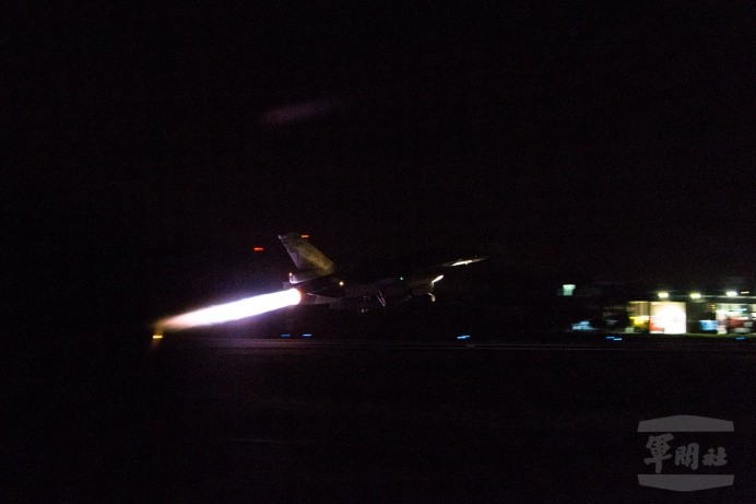 空軍嘉義基地F-16V戰機及空軍花蓮基地F-16戰機,飛行員及機工長共同執行戰機飛行前360度檢查後,戰機逐一滑出機庫,並在夜間7時45分起依序起飛,發動機的聲響及噴射出的橘紅色尾焰,在黑暗中格外明亮,升空攔截進犯之敵。