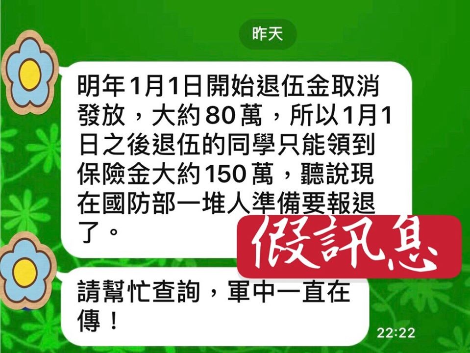 國民黨立委吳斯懷15日下午在臉書表示,近日有許多人在網路平台接獲明年起將取消退伍金發放的訊息,經他協詢國防部後證實為假訊息,因此批評,「動搖軍心 其心可議」。