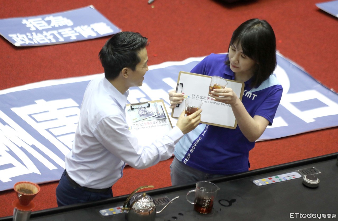 ▲何志偉進議場沖咖啡為慈善團體義賣募款,謝衣鳯花三千元買一杯。(圖/記者屠惠剛攝,下同)