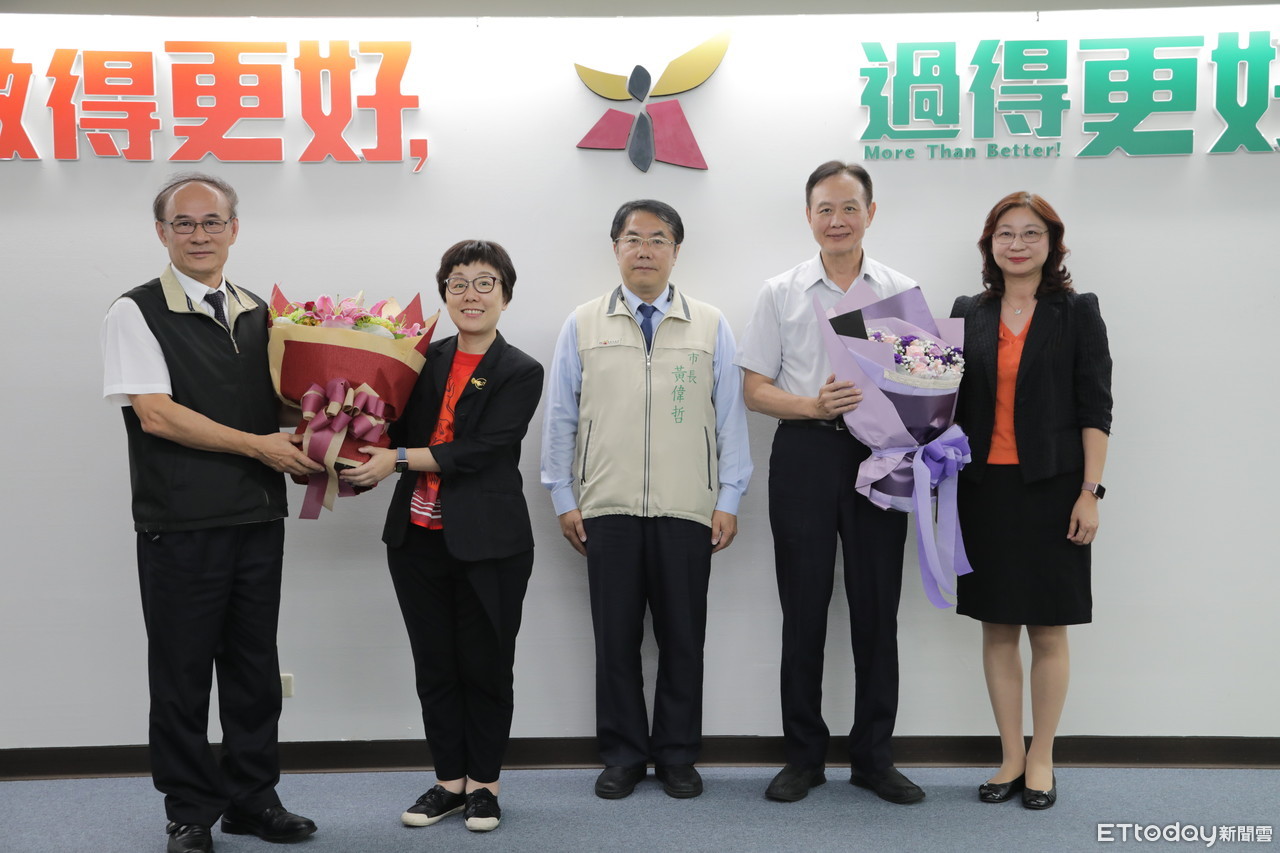 ▲台南市長黃偉哲在15日市政會議中,特別藉由頒發感謝狀來歡送要離開台南市的副市長王時思(左二)、警察局長周幼偉(右二)。(圖/記者林悅翻攝,下同)