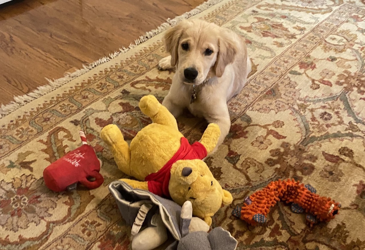 ▲美國國務卿蓬佩奧(Mike Poempeo)在推特個人帳號發布一張照片,畫面中是愛犬馬爾瑟(Mercer)與牠「最喜愛的玩具」,其中也包括「小熊維尼」。(圖/翻攝Twitter@mikepompeo)