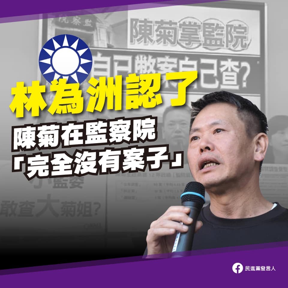 民進黨16日下午在臉書指出,國民黨立法院黨團總召林為洲15日在電視節目中,承認總統府秘書長陳菊,並沒有任何案子在監察院。