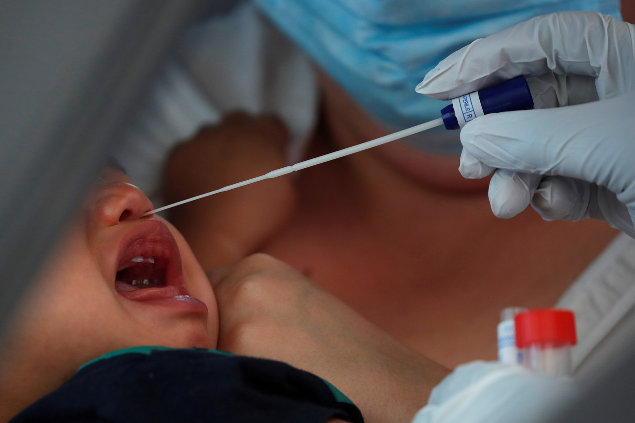 ▲ 法國拉瓦勒一名幼童接受新冠病毒篩檢。(圖/路透)