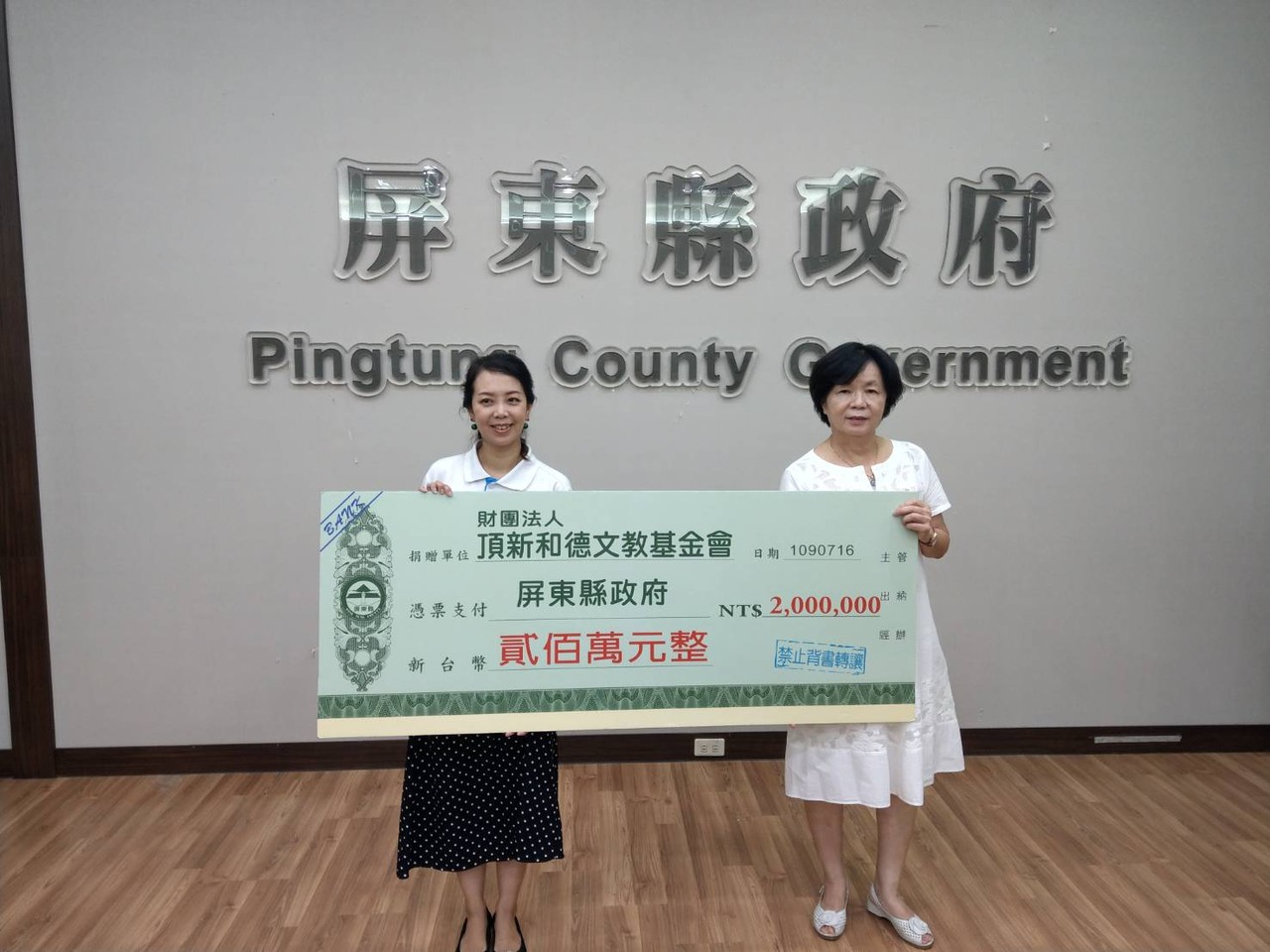 縣府於7月16日(四)上午假本府辦理「新臺幣200萬元」公益捐贈儀式,吳麗雪副縣長親自頒發感謝狀予「財團法人頂新和德文教基金會」,典禮上也特別感謝「財團法人頂新和德文教基金會」熱心公益、樂善不倦,長期投入教育、社福、環境、產業等4大領域之公益活動。適時提供本縣有緊急安置需求之福利邊緣弱勢民眾(含身心障礙者)建構安全、溫暖、舒適的棲身之所,避免因經濟困境陷入無棲身之所,而影響基本之生存權。