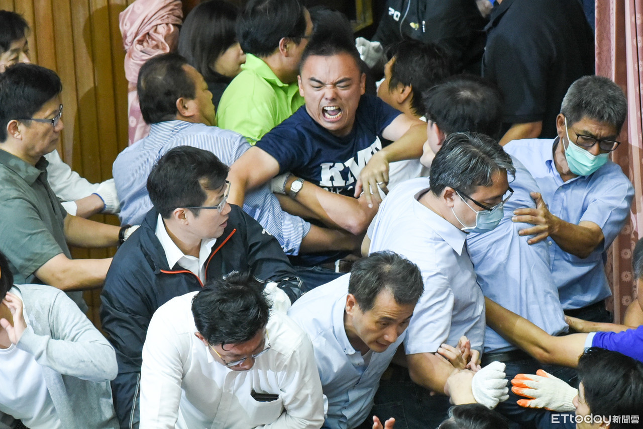 幾分鐘後,洪孟楷返回議場支援,還直接跳上主席台,不過,才站上去一下子,就在混亂推擠中摔落地面,二度被民進黨立委抬出場外。