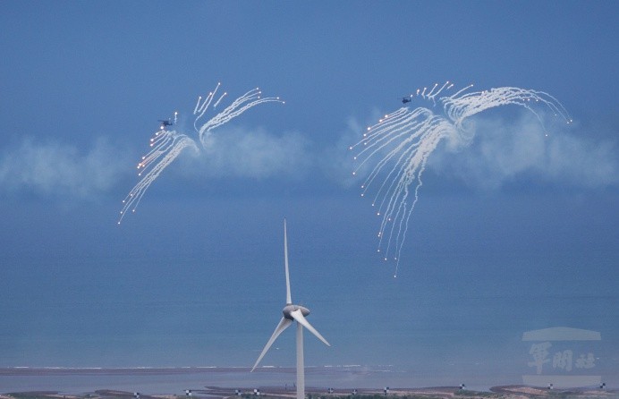 國軍第五作戰區16日在臺中甲南海灘執行漢光36號演習「三軍聯合反登陸作戰實彈操演」,陸航AH-1W眼鏡蛇攻擊直升機對敵發射火箭彈後,直升機拋射熱焰彈脫離。(軍聞社卓以立)