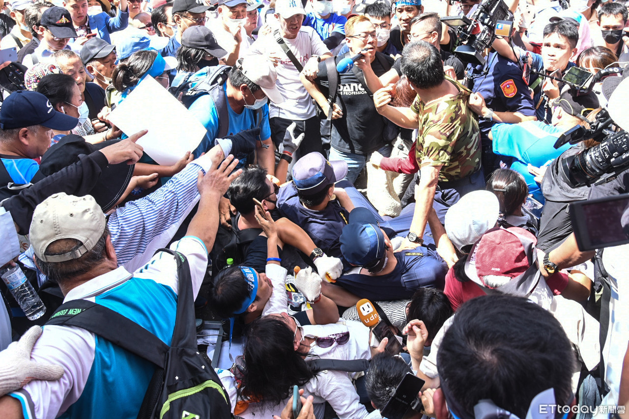國民黨戰車麥克風手於群眾後方高喊「不要砸警察」完全無效,目前約有50多位民眾站上拒馬,包含杏仁哥在內,爆發激烈推擠。