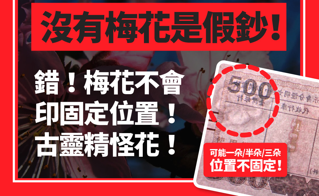 由於民眾最關注「防偽問題」,也使網路上出現「沒有梅花是假鈔」等謠言。蘇貞昌澄清,「錯!梅花不會印固定位置!古靈精怪花,也不會因為溫度越低就越多。」