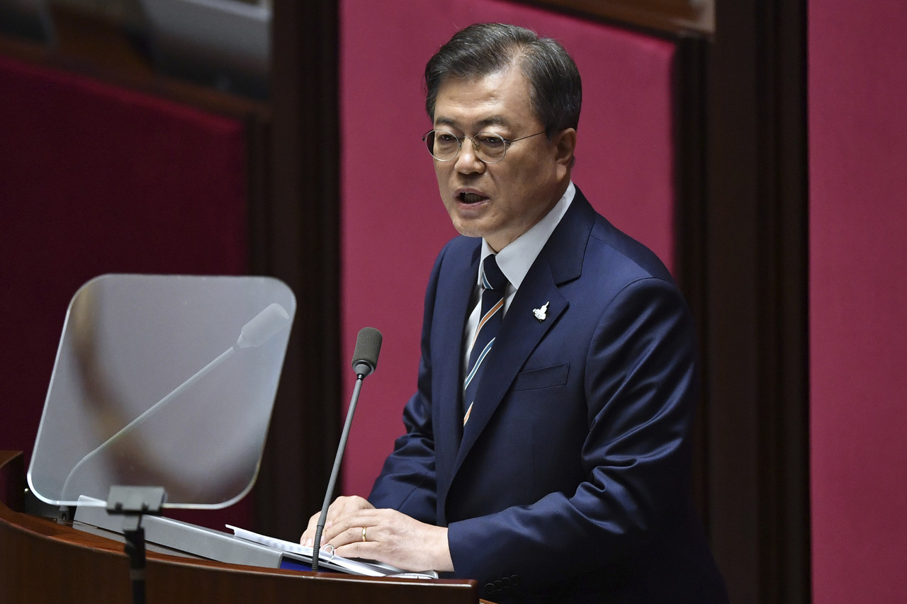 ▲文在寅舉行21屆國會議員開院演說,走出場外時慘遭扔鞋抗議。(圖/達志影像/美聯社)