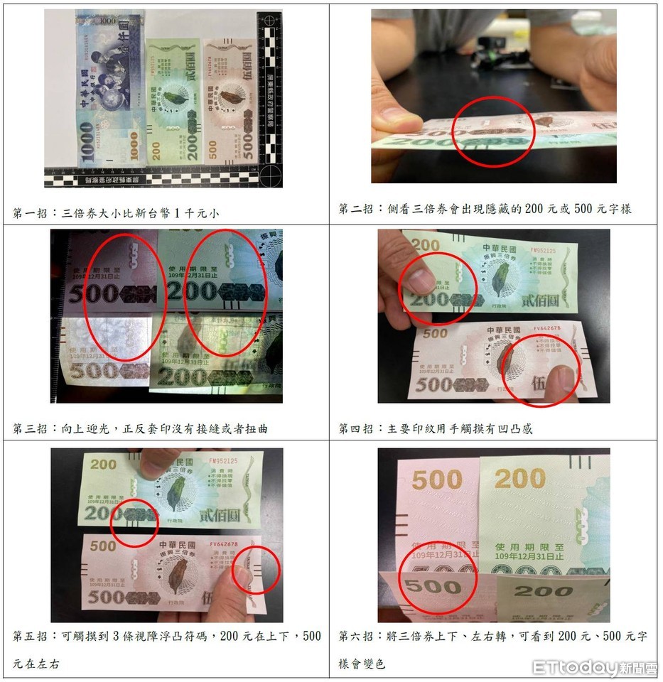 若沒有放大鏡或紫外線燈也可以依下列簡易方式來辨識:「看一看」:第1招:3倍券大小比新台幣1千元小;第2招:側看三倍券會出現隱藏的200元或500元字樣;第3招:向上迎光,正反套印沒有接縫或者扭曲。