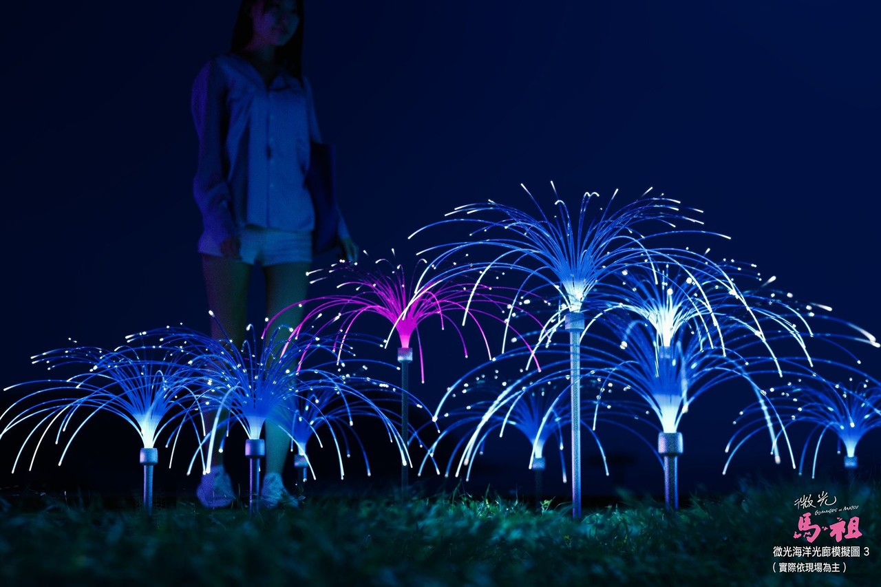 馬管處首度以「藍眼淚微光」意象搭配戰地坑道,設計出夜光藝廊,讓地上微光與海上藍眼淚相互照映,邀請遊客前來馬祖卡蹓(馬祖話「遊玩」之意),其中活動最大亮點「微光海洋光廊」於18日晚間6點正式點燈,透過燈飾營造路上藍眼淚景象。