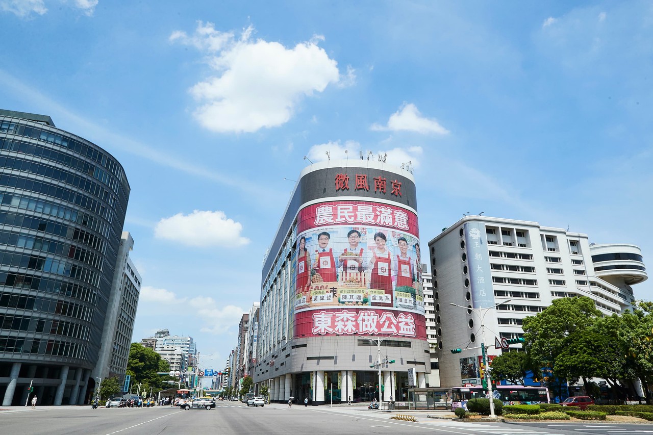 ▲台北市微風南京百貨外牆出現藍綠共同合作超大廣告,原來是東森購物上半年度投身公益助小農的卓越成績展示!(圖/東森購物提供)