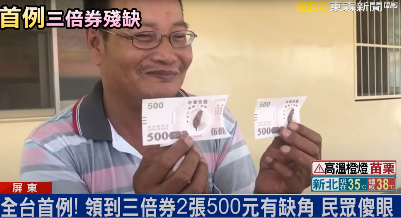 屏東沈姓男子日前到郵局領3倍券,未料,打開時卻發現其中2張500元竟然都缺角,其中一張更是連編號都沒有!沈男受訪時表示,原本非常緊張,擔心是自己撕破,但包裝袋裡卻怎麼也找不到缺角,最後只好上網求助廣大的網友們,這也讓他不禁大嘆「還是直接發現金最實在」。