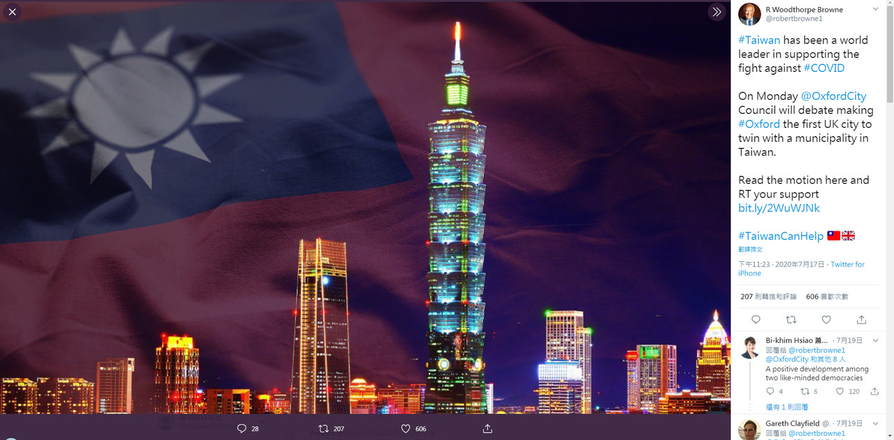 自民黨籍議員高達德7月8日提案與台灣城市締結姊妹市,同黨議員韋德(Elizabeth Wade)連署支持,牛津市議會於英國當地時間20日晚間以視訊會議方式進行討論。