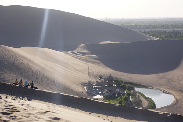 這裡除了鳴沙山之外還有一個月牙泉,但怎麼看就只有山而不見泉?原來月牙泉就隱身在這一座座巨大的沙丘之後,直到我們站上的沙丘才得以看清他的全貌,也難怪如此的神祕了!可以看到一個不大的綠洲,其中間有座樓,旁有一處彎曲如新月般的池塘,構成一幅奇特的風景,所以月牙泉也就由此得名。