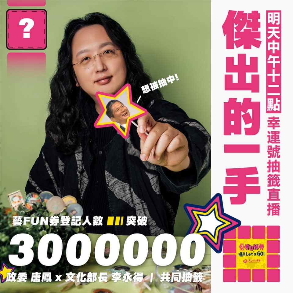 文化部推出「藝FUN券」APP從18日上午9點開放下載註冊,1個小時內註冊人數即突破30萬人,7小時突破100萬人,昨(20日)晚上9點截至,有超過300萬人完成登記,今(21日)中午12點將由文化部長李永得和政委唐鳳共同抽籤,預計將抽出200萬份「藝FUN券」,每份600元,抽獎狀況將線上同步直播。