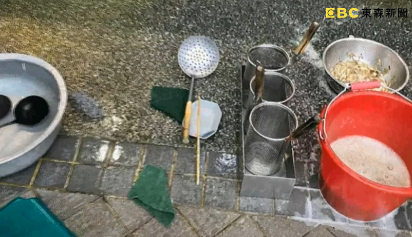 童姓女子日前向《東森新聞》投訴,看到鍋貼店不僅將廚餘桶擺在人行道地上,店員還把廚具通通擺在地上洗,位置就在捷運永春站出口旁,讓人看不下去,「碗啊!盤子、整個鍋子、挖湯的勺子,全部拿起來放在地板上啊!」搞得滿地油膩膩,差點摔倒。