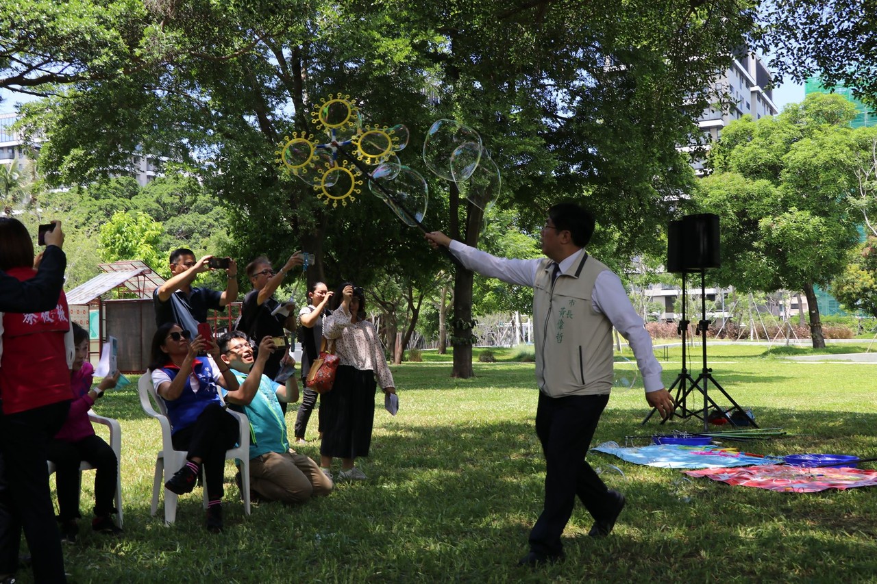 ▲台南市長黃偉哲出席開幕記者會,並開心體驗泡泡遊戲。(圖/台南市政府文化局提供)