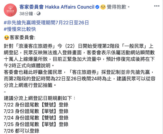 客家委員會加碼推出28萬份800元的「浪漫客庄旅遊券」,今(22)日起開放一般民眾登錄抽籤,只要加入客委會官方LINE,參加活動登錄即具有抽籤資格;不過一早9點開放後,民眾即塞爆客委會官方LINE,系統一度當機無法運轉,客委會也於10點多在官方臉書公開致歉,表示「目前正緊急加大流量中」,同時公布最新措施,建議依照身份證尾數單雙號「分流登錄」,強調活動並非「先搶先贏」。