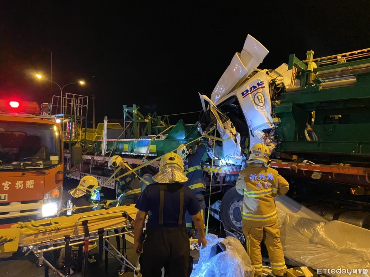 新竹縣竹北市西濱公路南下「協榮加油站前」在22日晚間8時25分,發生3部聯結車相撞的車禍事件,聯結車頭直接衝撞前方聯結車拖板,造成車頭嚴重變形,1名駕駛受傷,另1名駕駛命危,送醫急救後宣告不治。