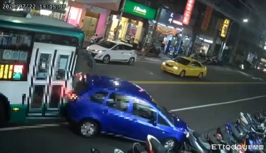 ▲無照的男子駕駛藍色租賃轎車,花3分鐘迴轉撞上公車後肇逃。(圖/記者陳豐德翻攝)