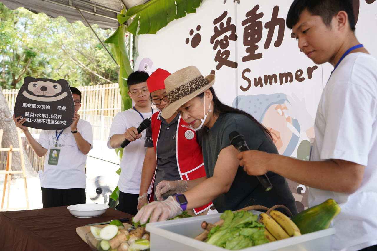 今日活動也請來動物園飼育員阿娟化身「小當家」,陪沈慧虹副市長體驗夏令營的課程「動物保母大挑戰」,幫馬來熊製作並調配餐點,將原形的食物切成馬來熊好入口的大小,也體會到飼育員平常不只要兼顧動物們的胃口更要用心計算每種營養的份量,讓動物們都能快樂在動物園生活。