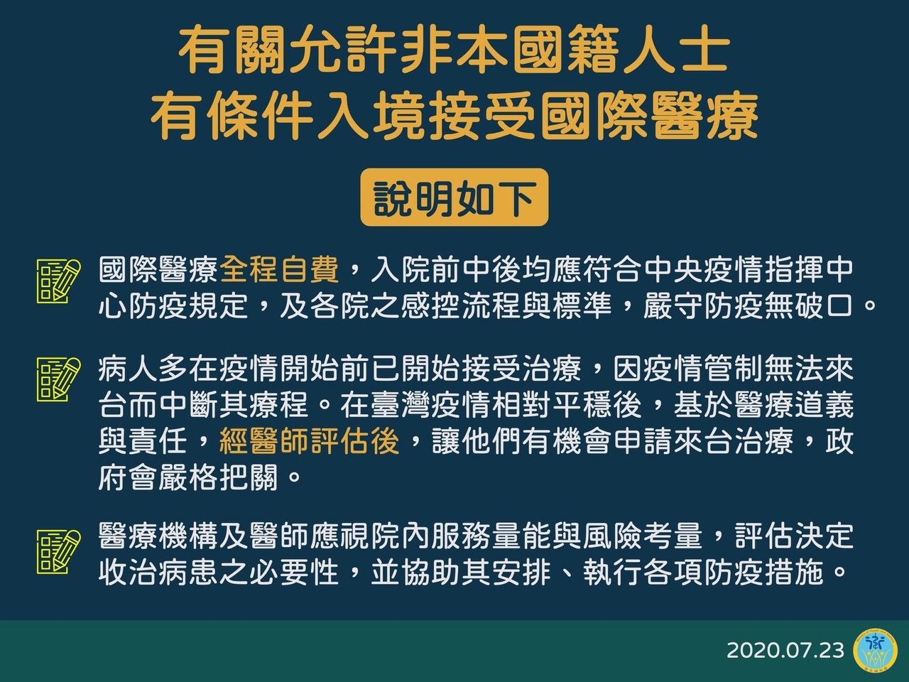 受到新冠肺炎疫情影響,自今年3月19日實施邊境管制措施,限制非本國籍人士入境,使部分國外病人無法來台而中斷治療。中央流行疫情指揮中心宣布8/1將有條件開放外籍人士來台就醫,排除醫美、健檢等非急迫性醫療,國際醫療病患可透過醫療機構檢具相關資料、文件提出申請,將依醫療必要性、療程延續性及風險性等原則進行審查。