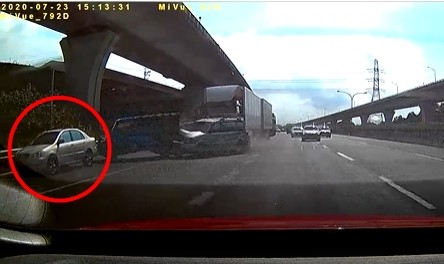 國道一號中山高昨日下午3時左右發生一起連續追撞車禍,在北上林口出口前,一輛白色貨櫃聯結車駕駛疑似恍神,沒察覺前方塞車,在沒有踩煞車的情況下連續追撞上前方4輛客車,也有眼尖的網友發現,右側車道上一輛金色的小客車全身而退,完全躲過聯結車的襲擊。