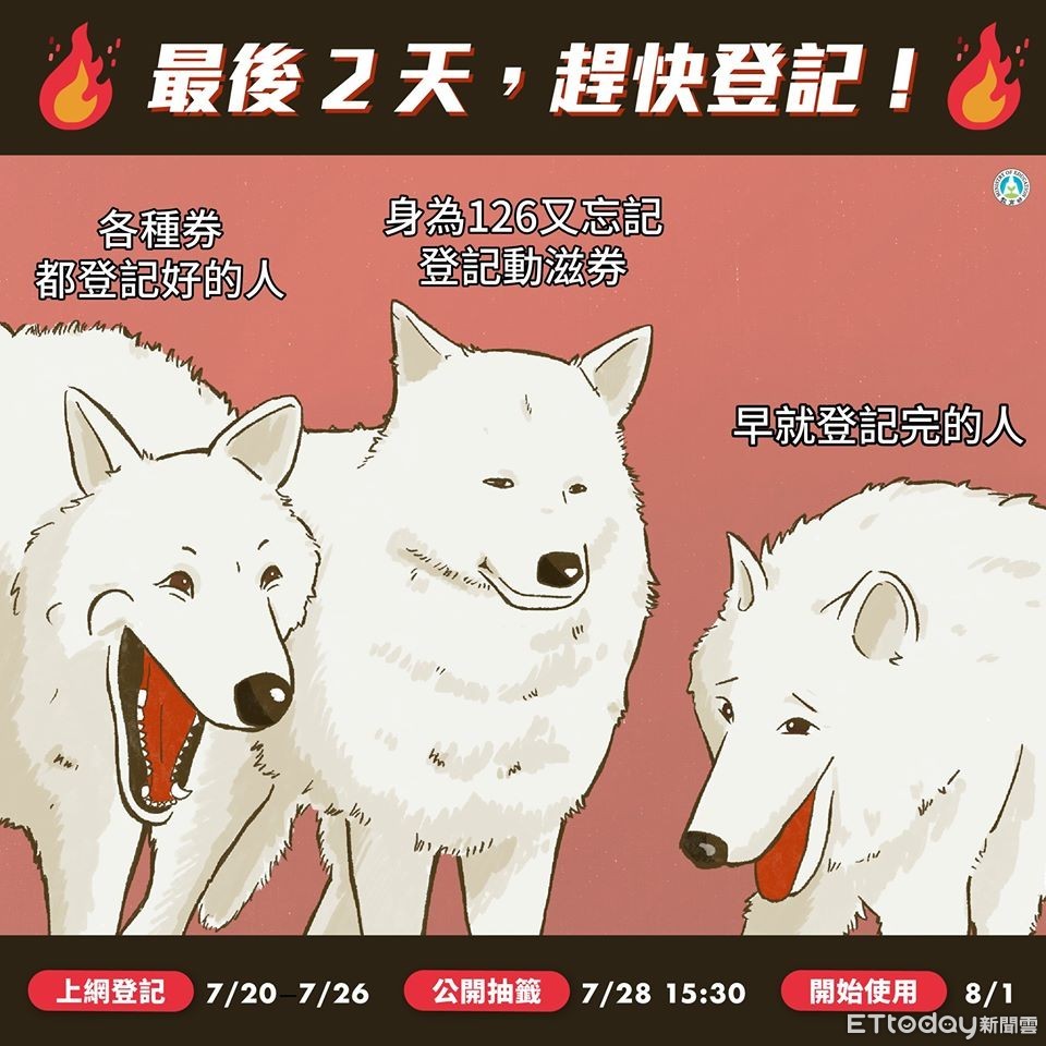 教育部體育署推出「動滋券」明(26日)登記最後一天,教育部臉書今日也提醒民眾,「登記時間即將截止,只到明天,錯過不再,要抽要快!」由於先前「藝Fun券」抽籤身分證字號尾數1、2、6的民眾沒中被笑稱邊緣人,這次教育部也特地製作圖片向他們喊話。