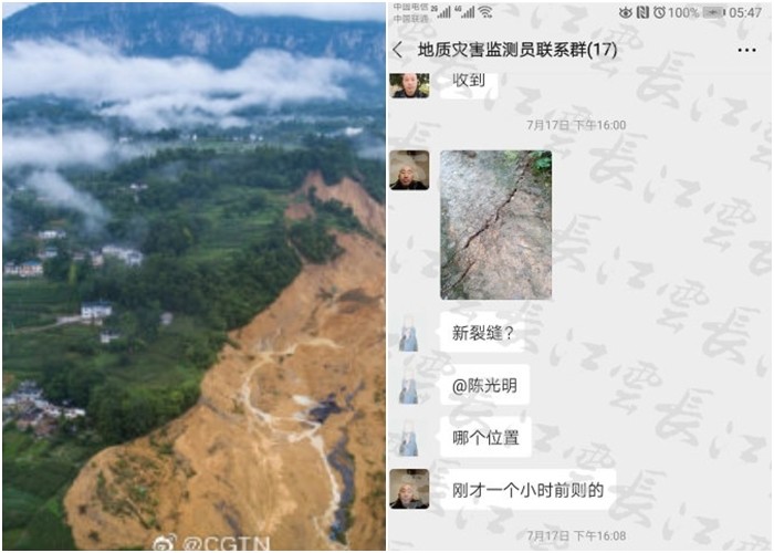 根據大陸《人民日報》報導,當地16日雨下了一夜,作為地質災害監測員的村民陳光明17日上午外出巡視,拍到地表裂縫照片,直覺有異,立刻透過手機群組回報。