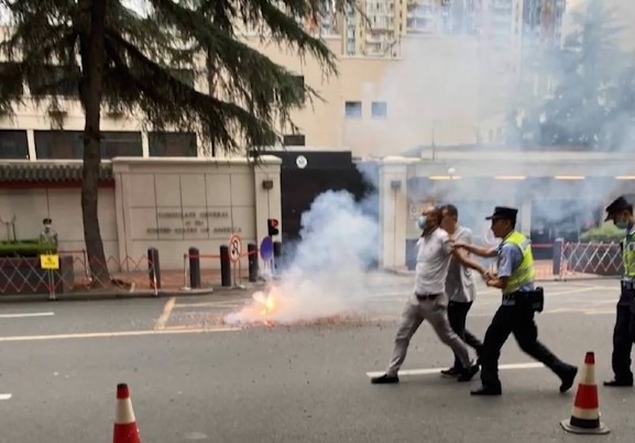 美國關閉中國駐休士頓領事館後,中國24日也報復性要求美方關閉駐成都領事館。當天就有民眾在領事館正門口外面的馬路上放鞭炮,被警方行政警告;另外有一名大媽在外面唱「我愛你中國」,還沒唱完就被公安制止。