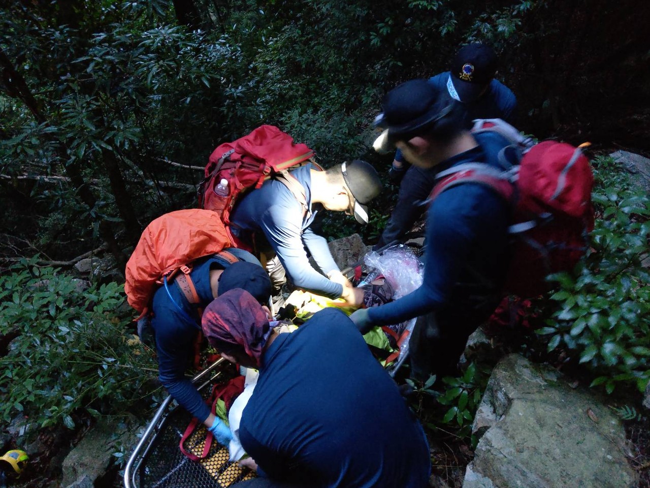 晚間8點42分回報,消防隊已順利接觸傷者,傷者意識清醒、頭部及眼睛有撕裂傷、四肢無力,給予頸圈固定及急救處置,已經順利將患者移動至稜線上,但現場路況不佳,於是請求增派4人支援,4人在清晨2點8分,已將患者送到達登山口,交由救護車送至中國附醫救治。