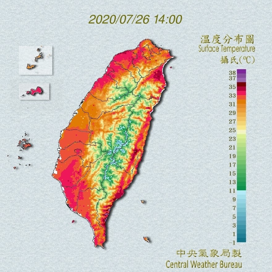 氣象局指出,今日各地高溫普遍達33至35度,其中東南部地區容易有焚風發生,有局部38度以上高溫的機率,台北盆地、西半部近山區平地或河谷及花東縱谷也有機會出現36度以上高溫,外出應做好防曬措施並多喝水以防中暑。