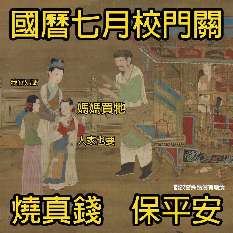國立故宮博物院南部院區日前在官方臉書上貼出《故宮院藏‧厭世媽媽梗圖系列》,用古畫看圖說故事,內容包括「國曆七月校門關,燒真錢,保平安」,要帶小孩出去玩,還要花錢買玩具;還有搭配連鎖賣場的諧音梗,「請支援收嬰,暑假登場、阿嬤很忙」,孩子放暑假期間,家長還是要工作上班,許多人會拜託家中長輩幫忙照顧小孩。