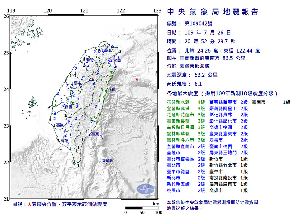 超大一晃!今(26)日20:52左右,東部海域附近發生有感地震,國家級警報大響,告警範圍包含宜蘭縣、台北市。根據氣象局地震報告,東部海域規模6.1地震,深度53km,各地最大震度花蓮4級、宜蘭3級、台東3級、南投3級、雲林3級、台北2級、台中2級、新竹2級、桃園2級、苗栗2級、嘉義2級、彰化2級、高雄2級、台南2級、屏東2級。