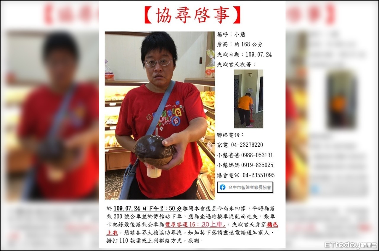 社會局表示,由於小慧患有心智障礙,不會講話,不懂求助也沒有手機,身上只有一本台中市智障者家長協會的聯絡簿,走失後讓2名年邁的父母相當焦急,2人頂著35度高溫在公車沿途停靠站尋找,多日未曾闔眼、喉嚨喊到發不出聲音,讓旁人看了非常不捨。