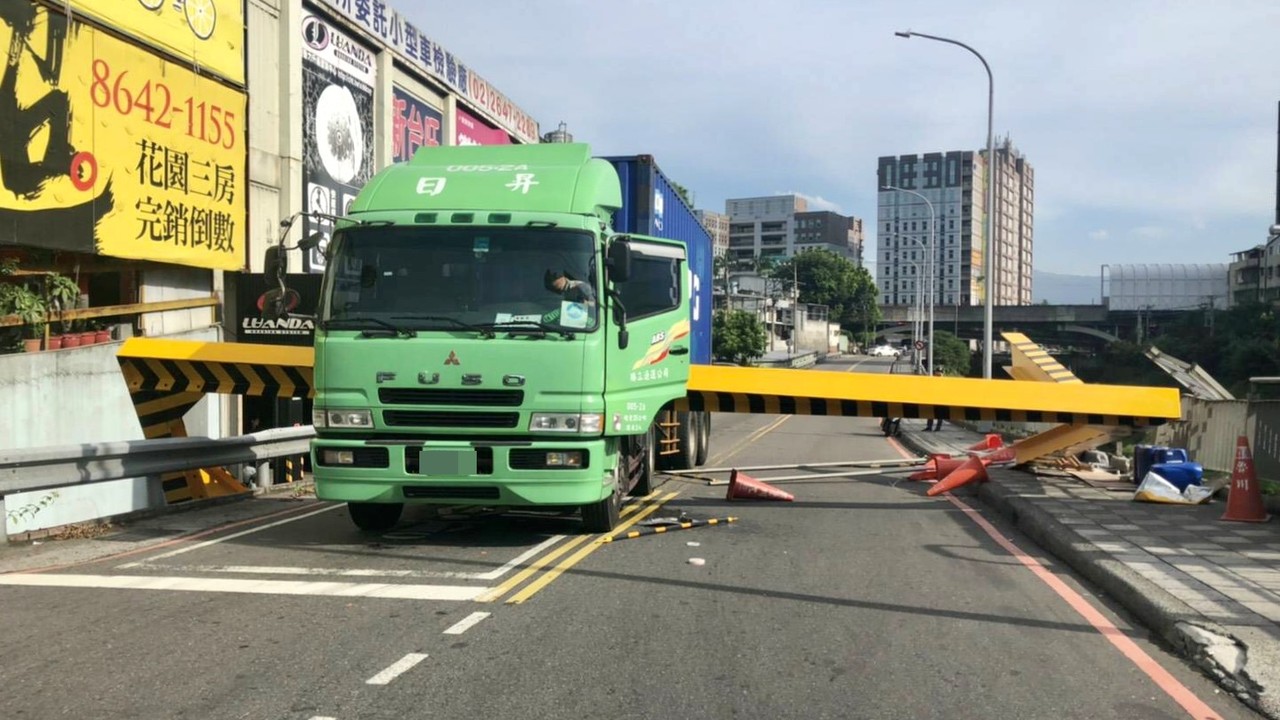 新北市汐止區新台五路27日上午發生一起車禍,一輛聯結車行經該路段時因未注意路況而撞上限高架,當場卡在路中央,黃色的限高架應聲倒地,導致該處雙向無法通行,車流嚴重回堵,警消獲報後立即趕赴現場處理。附近民眾指出,該限高架昨晚10時才剛裝上去,沒想到還不到12小時,一早就遭聯結車撞毀。目前確切事故發生原因還有待釐清。
