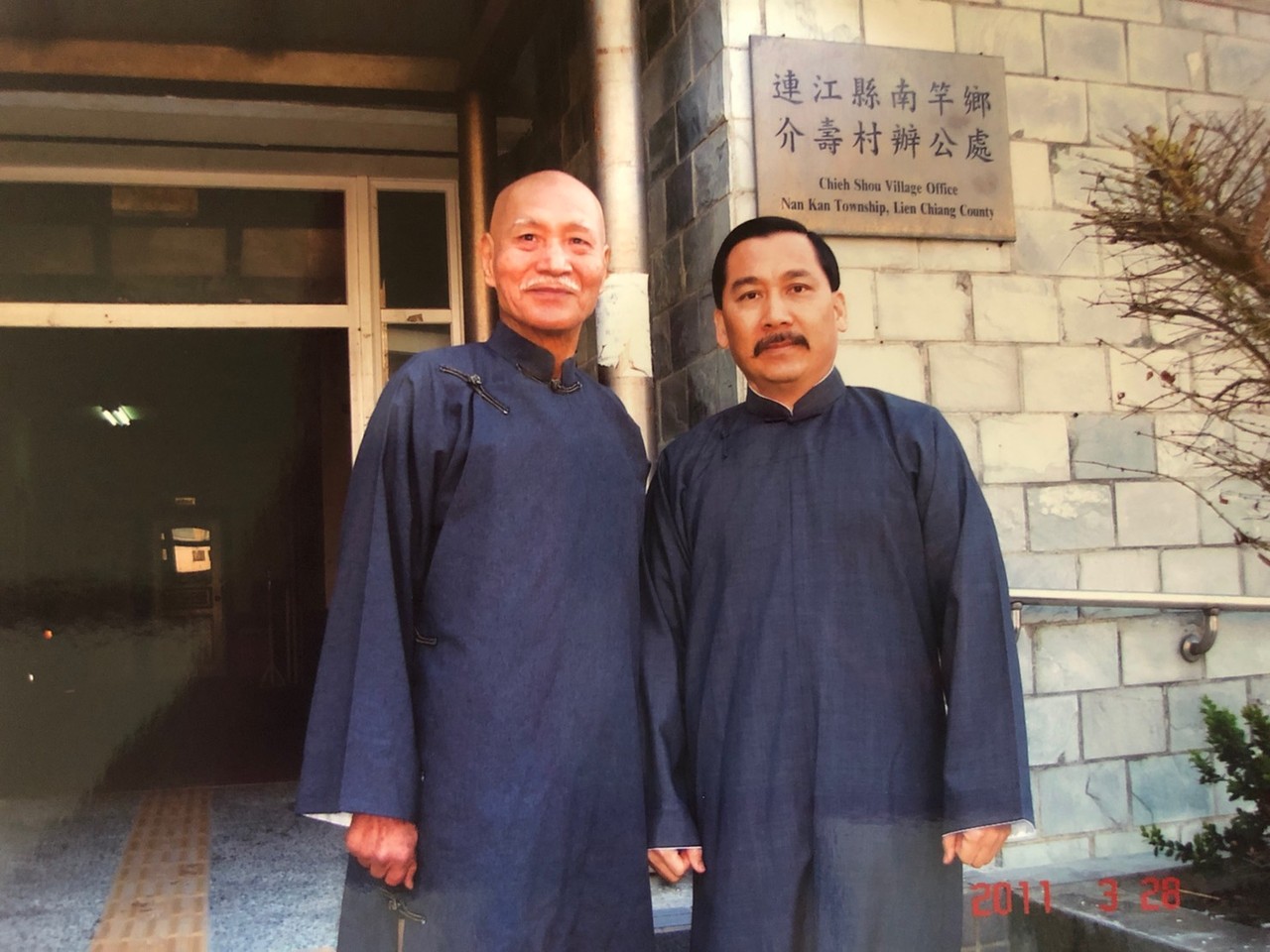 ▲「蔣公」李登科與「國父」葉重順早年穿上中山裝一起出遊。(圖/葉重順提供)