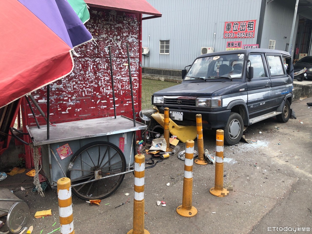 ▲小貨車恍神衝撞路邊汽車波及香腸嬤,車上雞蛋也因此破蛋。(圖/民眾提供)