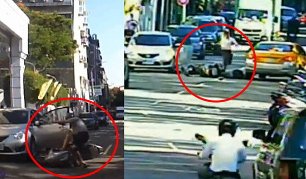 根據行車記錄器畫面,一輛轎車臨停在士林區的黃線上,駕駛卻突然開門,導致同向經過的一名騎士根本來不及閃,連人帶車撞上車門,遭對向一輛計程車輾到車底。臨停駕駛發現事情大條,趕緊打電話報案,將騎士送醫治療。