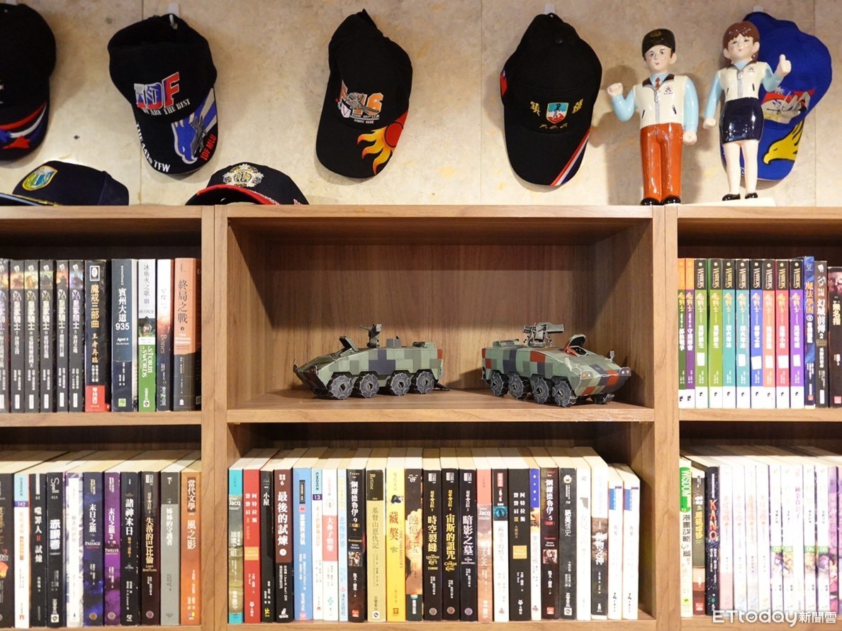 ▲▼整面書牆各式各樣的書籍都有,書櫃上擺設各軍種的帽子,打造出軍事風格。(圖/花蓮市公所提供,下同)