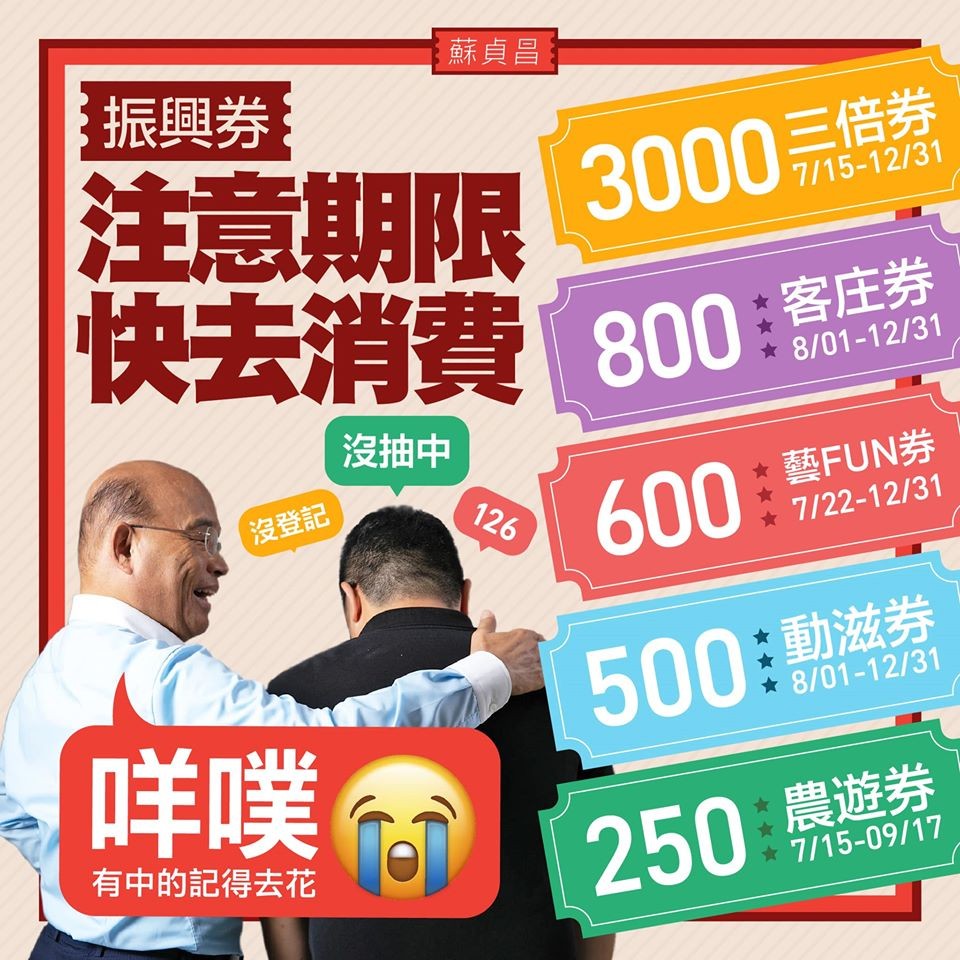 蘇貞昌30日透過臉書表示,動滋券、客庄券、藝FUN券、農遊券 都已經開獎,無論你有沒有中獎,至少三倍券是人人有獎。請大家趕快領、趕快花。振興券都有期限,請大家把握時間,多多消費!