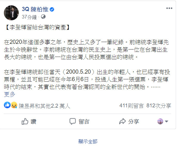 陳柏惟表示,在2020年這個多事之年,歷史上又多了一筆紀錄。前總統李登輝先生於今晚辭世。李前總統在台灣的民主史上,是第一位在台灣出生長大的總統,也是第一位由台灣人民投票選出的總統。李登輝時代的結束,其實也代表有著台灣認同的全新世代的開始。
