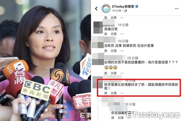 高雄市長補選即將到來,而國民黨籍市議員李眉蓁,則代表國民黨參與此次選戰,但日前卻有民眾在新聞底下留言表示,「砍李眉蓁比砍情敵好多了吧,還能領優良市民獎狀」。對此,李眉蓁表示,對於此事表示強力譴責,並強調會去報警。