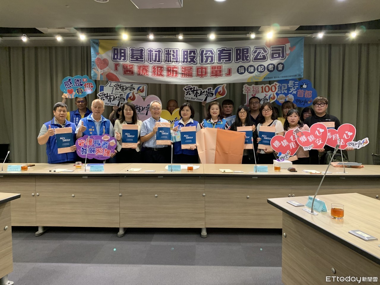 明基材料股份有限公司透過雲林縣工商發展投資策進會許宇甄總幹事居中牽線,董事長陳建志回饋家鄉雲林縣,代表公司捐贈雲林縣政府1000份透氣透濕、安心防漏、防螨抗菌、輕量快乾、環保無毒之「醫療級防漏中單/看護墊」,彌補安養機構資源不足之問題,並以優質產品提升照護品質,善盡關懷責任,讓本縣已接受安置之83位中低收入或低收入戶長輩至長期照顧機構,獲得妥善之照顧。
