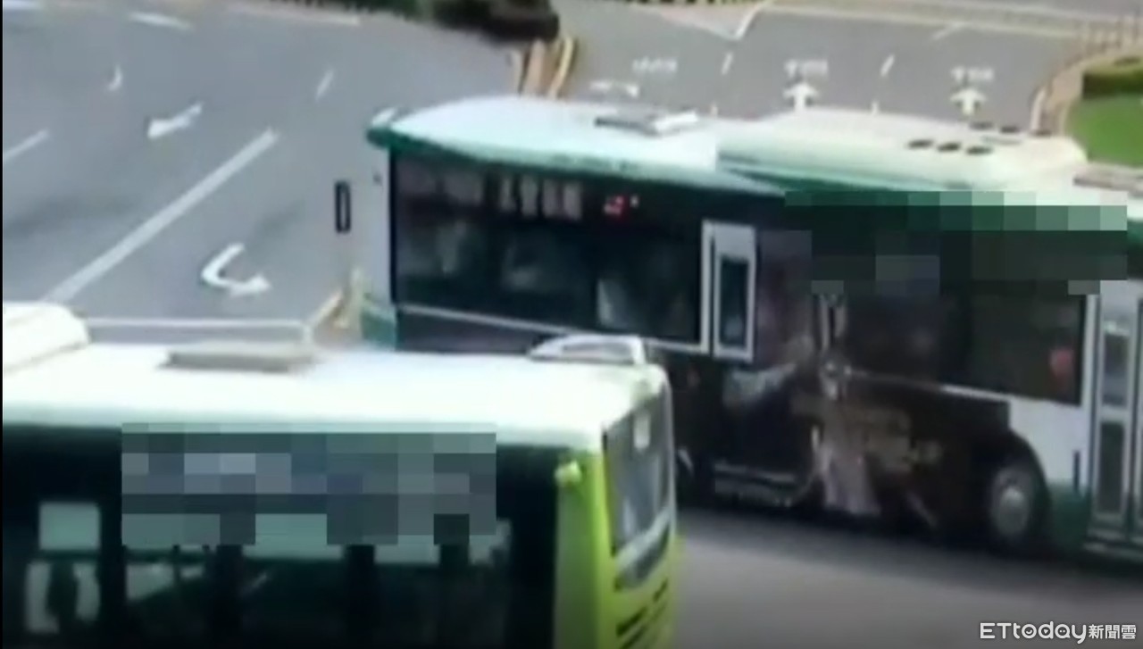 ▲北市自家公車(後者)機場前對撞,司機急煞畫面曝光,雙手慘被玻璃割傷送醫。(圖/記者邱中岳翻攝)