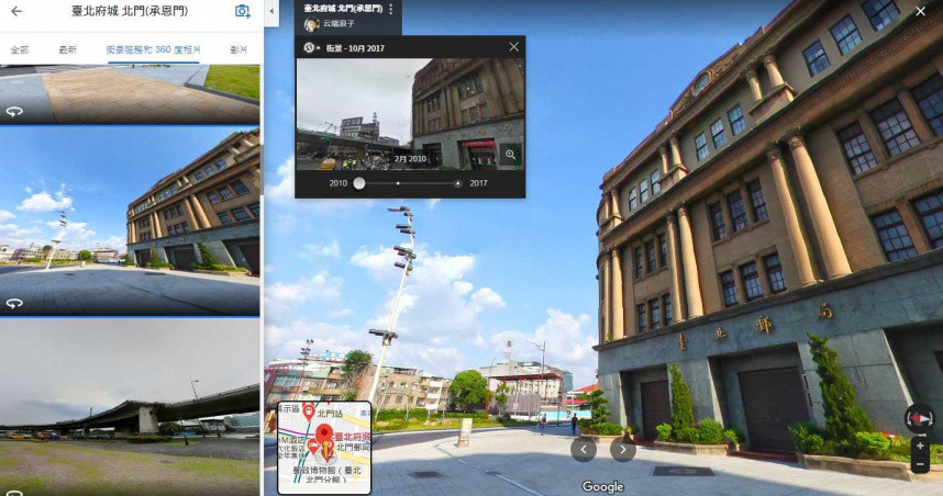 例如想知道大稻埕或北門這幾年變遷的樣貌,只要打開地圖的街景服務功能,再從左上角的時間軸點開小時鐘(如圖),從2008年到2020年有很多不同的景像和時間軸可以選。當然,「街景時光機」憑藉的是,12年來曾多次在同一個地點做拍攝,累計下來的珍貴畫面才能成就這個特別功能。