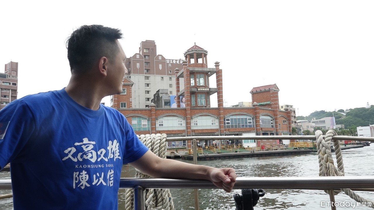 陳以信今天出現在高雄鼓山輪渡站前往旗津,之前擔任立法委員陳學聖助理的他,曾經在高雄住過一段時間,因為他特別選在旗津渡輪上頭再次提到之前備受爭議的「又高又雄」,還穿上一件印有「又高又雄」的衣服來講述這一段歷史。