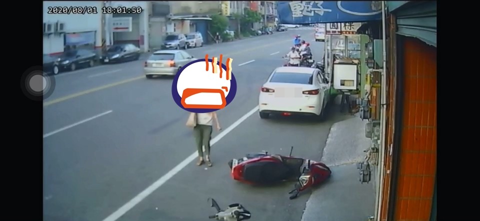男子將影片PO在臉書社團《新竹爆料公社》,從監視器畫面可以看到,一台白色自小客車打算停靠於白線上,緩慢倒退嚕的過程,「碰」的一聲,紅色機車當場倒地,而女子下車後,一臉輕鬆、事不關己的姿態,看了5、6眼,回眸一笑,還沒把車牽起,女子便瀟灑離去,而機車一個重摔落地,也導致煞車手把斷裂。