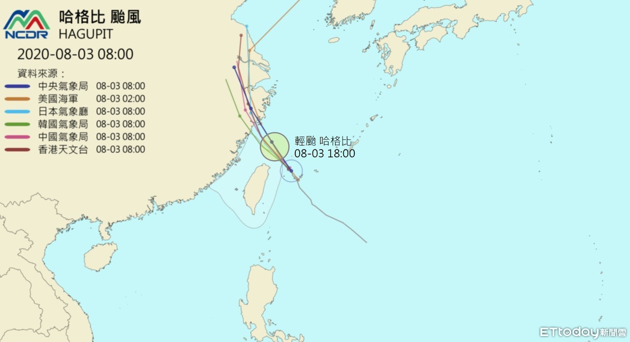 中央氣象局今天(3日)上午持續發布哈格比颱風海上颱風警報,預估未來12小時強度將達顛峰,並持續對11縣市發布「大雨特報」。根據國家災害防救科技中心(NCDR)整理各國最新路徑預報,各國看法大致一致,颱風中心大致從東北部海面掠過,一路到今日傍晚,颱風將逐漸偏北遠離台灣。
